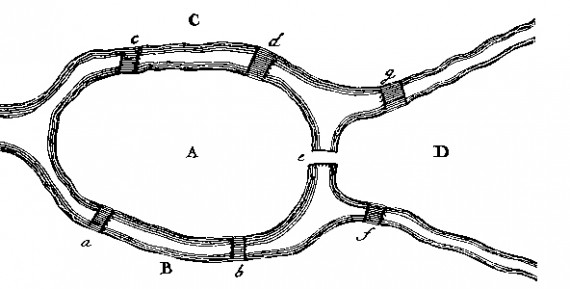 A famoun example of abstraction is the seven bridges of Konigsberg, which was a problem of how to cross all seven bridges in one walk. To solve this problem, Euler constructed a graph and proved it was impossible by showing that all of the nodes had an odd number of edges. This is how data abstraction works, where details of data are hidden. For example, not declaring data types in JavaScript, or even abstract data structures like queues and stacks.